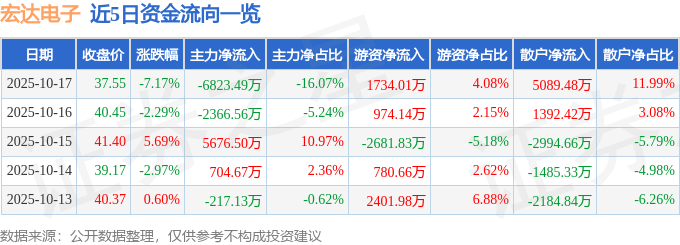 证券之星消息,截至2025年10月17日收盘,宏达电子(300726)报收于37.55元,下跌7.17%,换手率5.1%,成交量10.93万手,成交额4.25亿元。