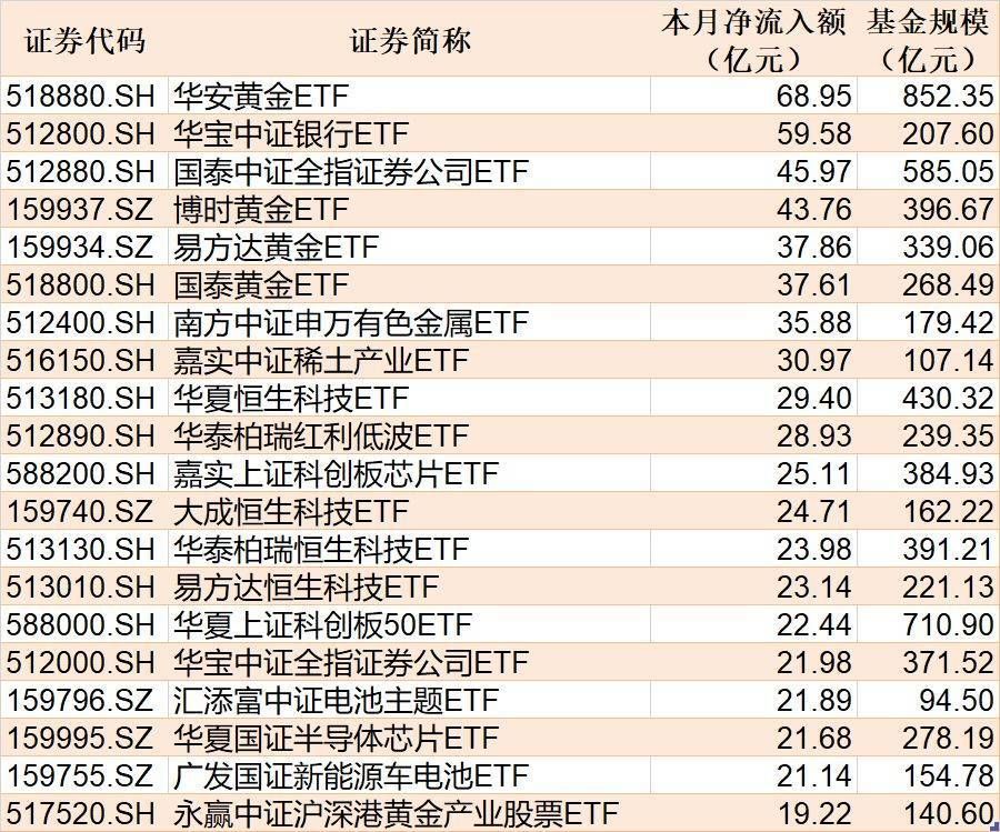 截至10月17日,本月资金净流入额居前20的ETF名单如下: