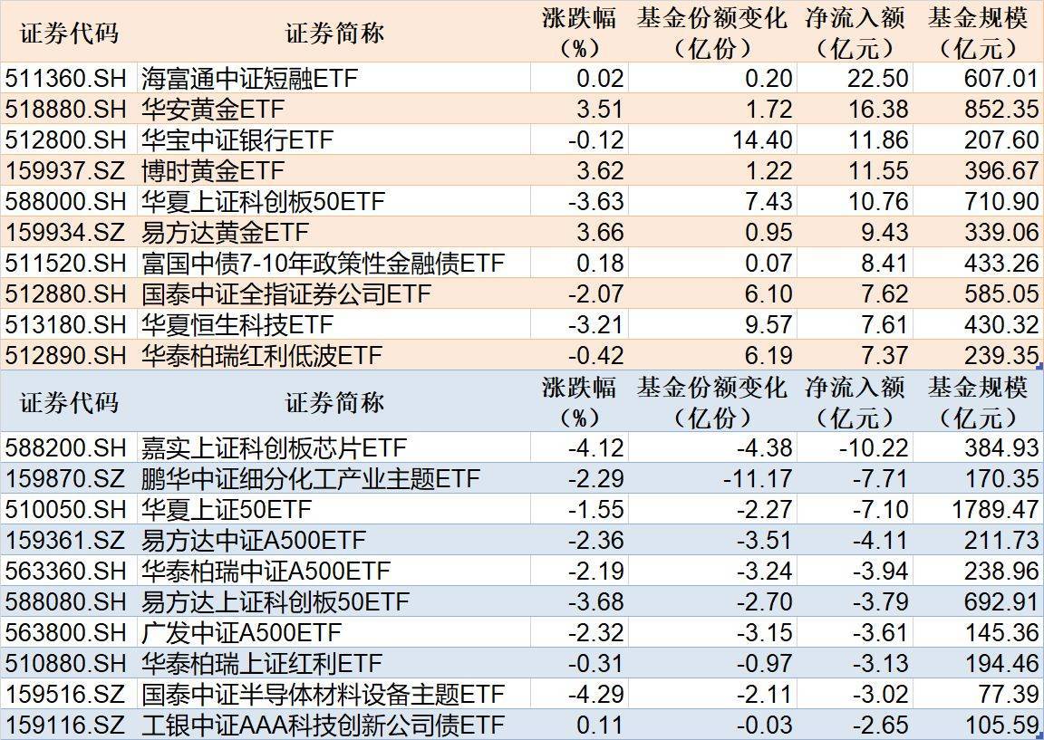 与此同时,嘉实上证科创板芯片ETF基金份额减少4.38亿份,净流出额为10.22亿元;鹏华中证细分化工产业主题ETF基金份额减少11.17亿份,净流出额为7.71亿元;华夏上证50ETF基金份额减少2.27亿份,净流出额为7.1亿元。