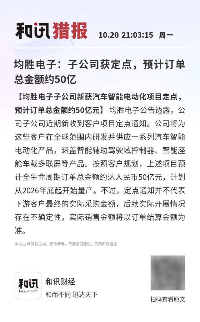 【均胜电子子公司新获汽车智能电动化项目定点,预计订单总金额约50亿元】均胜电子公告透露,公司子公司近期新收到客户项目定点通知。公司将为这些客户在全球范围内研发并供应一系列汽车智能电动化产品,涵盖智能辅助驾驶域控制器、智能座舱车载多联屏等产品。按照客户规划,上述项目预计全生命周期订单总金额约达人民币50亿元,计划从2026年底起开始量产。不过,定点通知并不代表下游客户最终的实际采购金额,后续实际开展情况存在不确定性,实际销售金额将以订单结算金额为准。