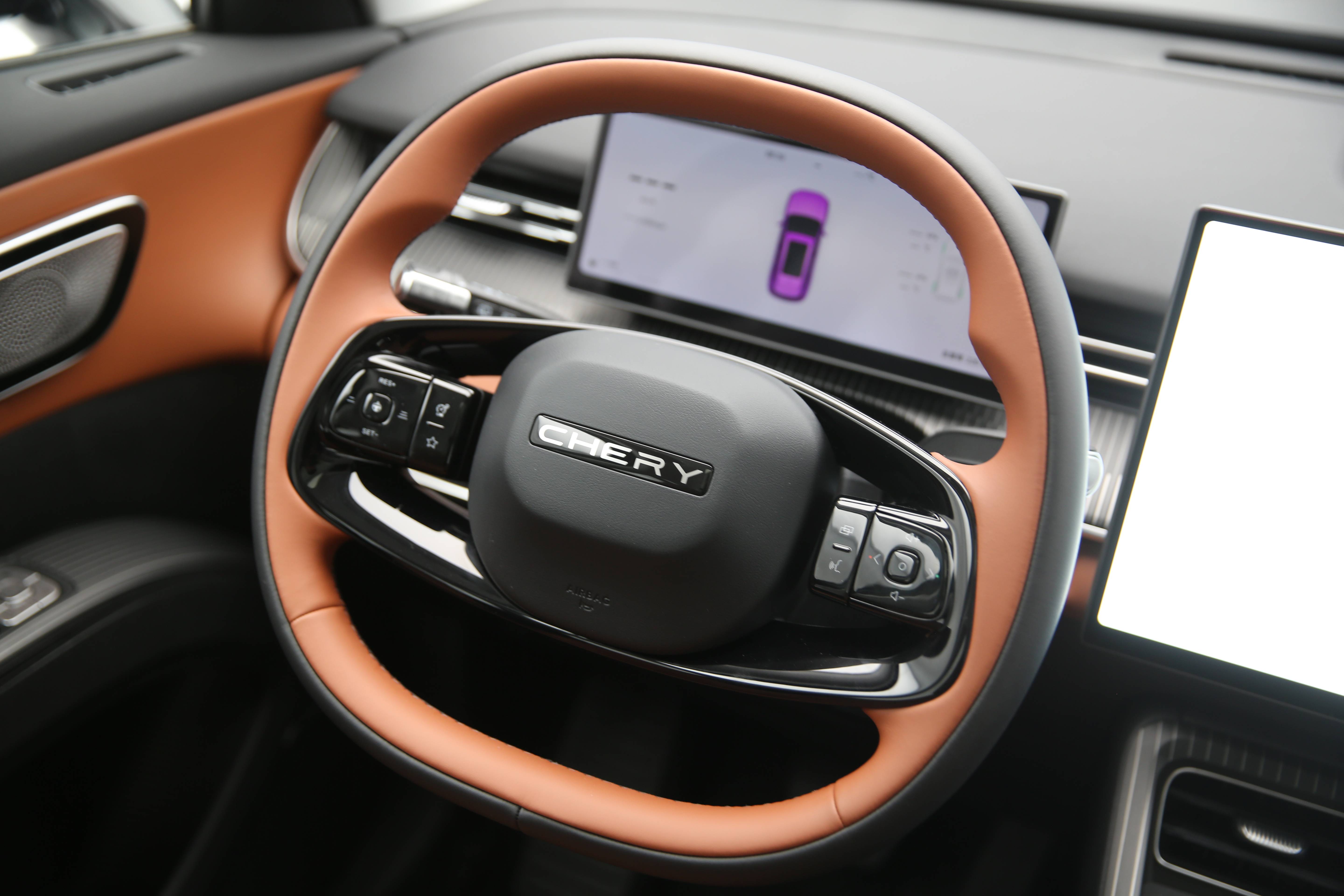 内饰部分,全新瑞虎8换装了全新样式的双辐方向盘,整个方向盘的持握还是非常舒适、顺手的。方向盘左侧是猎鹰智能驾驶辅助的一些相关按钮,左后方是控制自动雨刮的实体拨杆,右边的拨杆则是用来切换挡位的怀挡式电子挡杆,由此也将中控区释放出了更多的空间。此外,车辆的仪表台左下方是灯光调节控制面板,旁边还有电子手刹的控制键和一个储物盒。