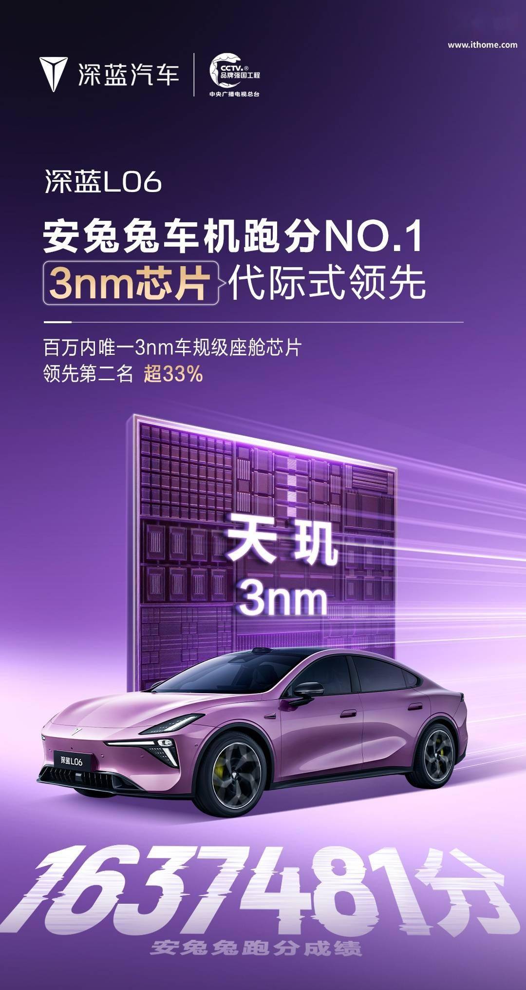 IT之家 10 月 21 日消息,深蓝汽车官方今日宣布,旗下搭载天玑 3nm 座舱芯片 —— 天玑座舱 S1 Ultra 的深蓝 L06 车型安兔兔车机跑分成绩为 1637481 分,位列榜单第一,超第二名 33%,号称“代际领先”。