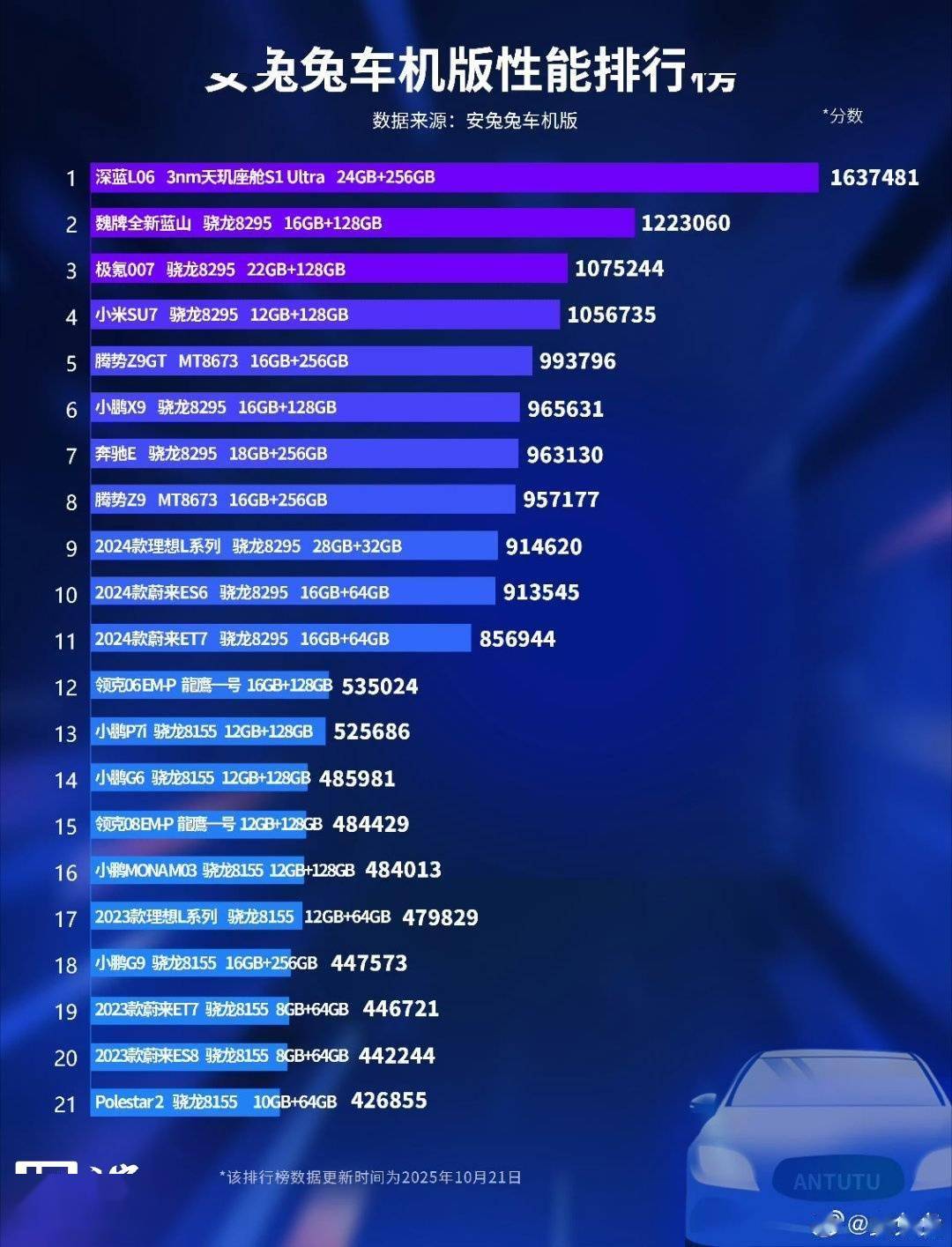 安兔兔车机性能排行榜(数据更新时间为 2025 年 10 月 21 日)显示:魏牌全新蓝山搭载骁龙 8295 芯片,辅以 16GB+128GB 规格,排名第二;极氪 007 搭载骁龙 8295 芯片,辅以 22GB+128GB 规格,排名第三;小米 SU7 搭载骁龙 8295 芯片,辅以 12GB+128GB 规格,排名第四;腾势 Z9 GT 搭载 MT8673 芯片,辅以 16GB+256GB 规格,排名第五。