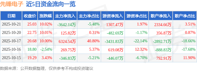 证券之星消息,截至2025年10月21日收盘,先锋电子(002767)报收于25.03元,上涨10.02%,已连续涨停3天,换手率21.0%,成交量27.34万手,成交额6.65亿元。
