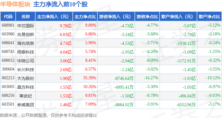 从资金流向上来看,当日半导体板块主力资金净流入36.47亿元,游资资金净流出24.81亿元,散户资金净流出11.66亿元。半导体板块个股资金流向见下表: