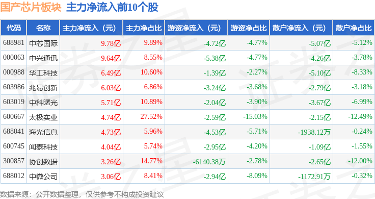 从资金流向上来看,当日国产芯片板块主力资金净流入77.4亿元,游资资金净流出42.37亿元,散户资金净流出35.03亿元。国产芯片板块个股资金流向见下表: