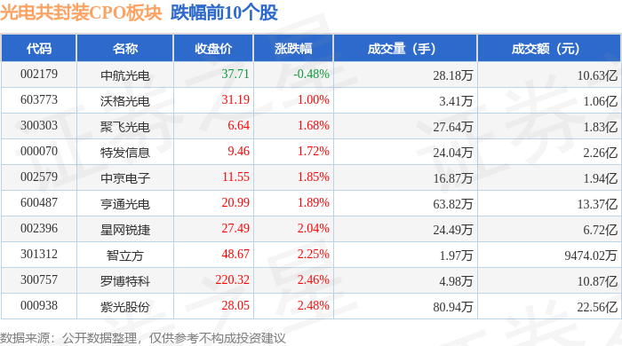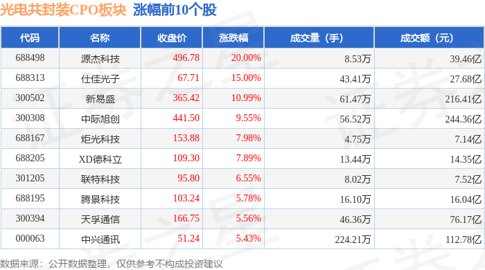 证券之星消息,10月21日光电共封装CPO板块较上一交易日上涨6.67%,源杰科技领涨。当日上证指数报收于3916.33,上涨1.36%。深证成指报收于13077.32,上涨2.06%。光电共封装CPO板块个股涨跌见下表: