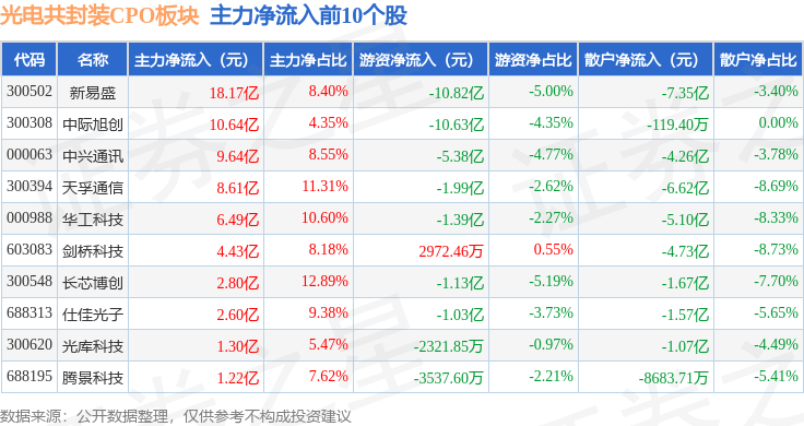 从资金流向上来看,当日光电共封装CPO板块主力资金净流入69.4亿元,游资资金净流出33.91亿元,散户资金净流出35.49亿元。光电共封装CPO板块个股资金流向见下表: