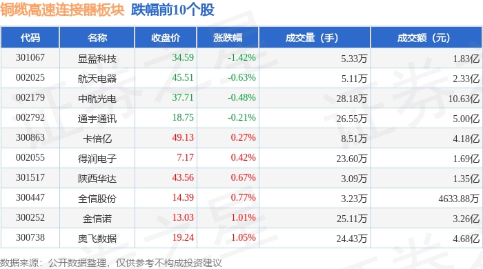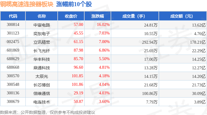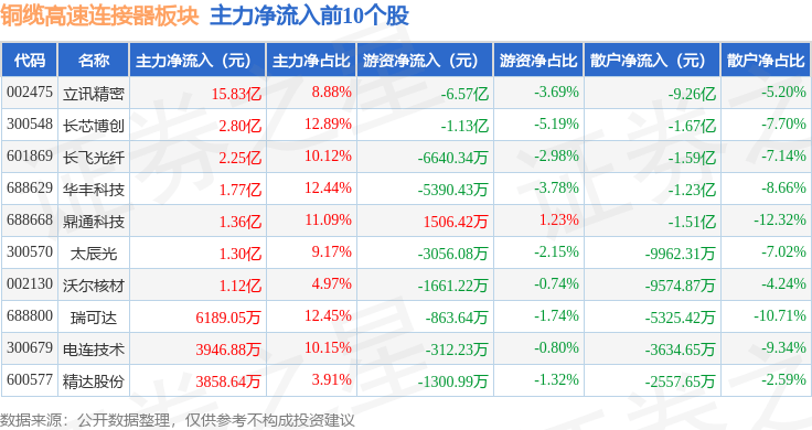 从资金流向上来看,当日铜缆高速连接器板块主力资金净流入25.79亿元,游资资金净流出10.88亿元,散户资金净流出14.91亿元。铜缆高速连接器板块个股资金流向见下表:
