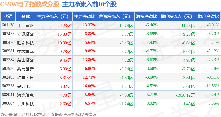 资金流向方面,CSSW电子(399811)指数成份股当日主力资金净流入合计107.3亿元,游资资金净流出合计53.08亿元,散户资金净流出合计54.22亿元。成份股资金流向详情见下表: