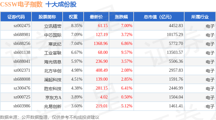 证券之星消息,10月21日,CSSW电子(399811)指数报收于5753.58点,涨4.24%,成交1856.17亿元,换手率2.1%。当日该指数成份股中,上涨的有55家,环旭电子以10.03%的涨幅领涨,下跌的有5家,扬杰科技以1.38%的跌幅领跌。