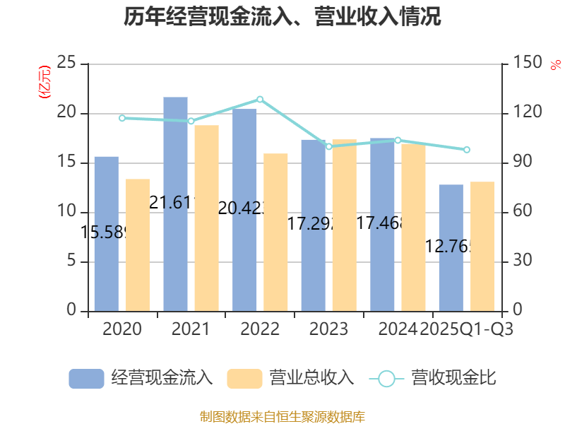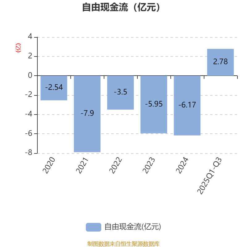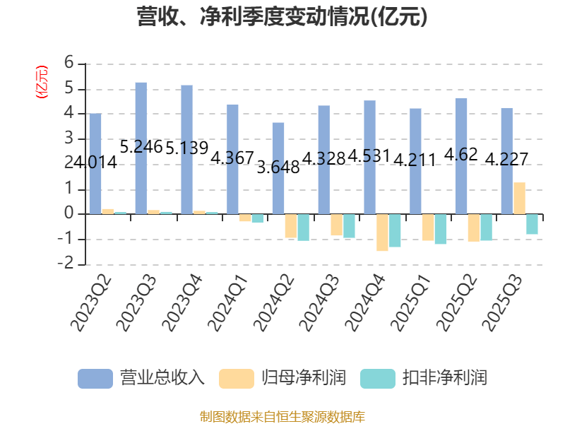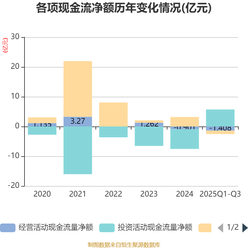 2025年前三季度,公司经营活动现金流净额为-1.41亿元,同比减少2.53亿元;筹资活动现金流净额-1.14亿元,同比减少3423.76万元;投资活动现金流净额5.7亿元,上年同期为-1.48亿元。