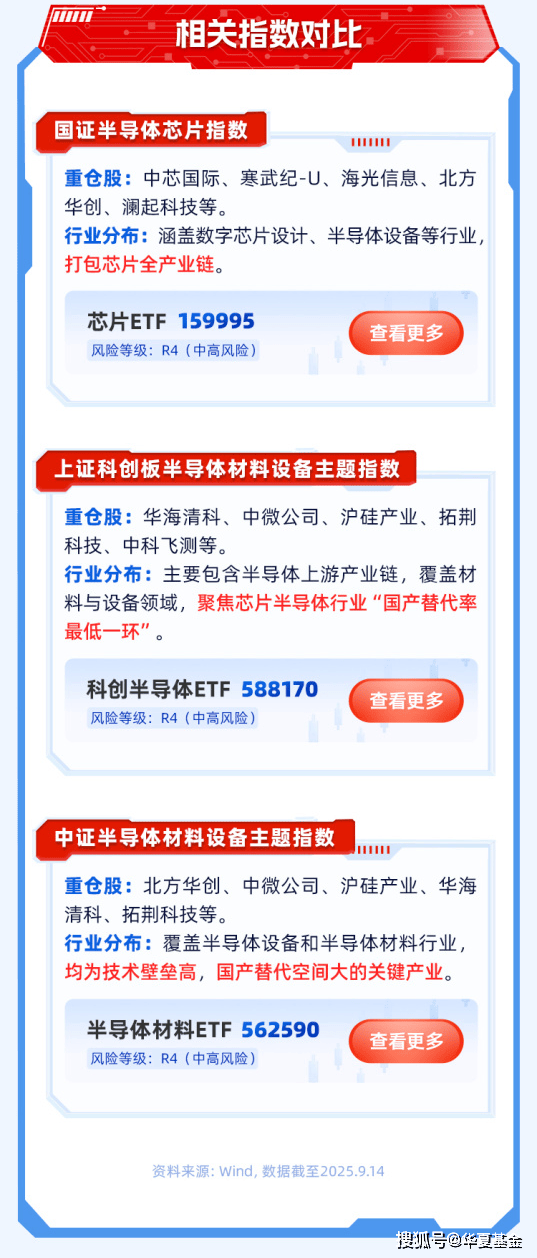 风险提示:1.以上基金为股票基金,主要投资于标的指数成份股及备选成份股,其预期风险和预期收益高于混合型基金、债券基金与货币市场基金,科创半导体ETF、半导体材料ETF、芯片ETF属于中高风险(R4)品种,具体风险评级结果以基金管理人和销售机构提供的评级结果为准。2.本基金存在标的指数回报与股票市场平均回报偏离、标的指数波动、基金投资组合回报与标的指数回报偏离等主要风险。3.投资者在投资本基金之前,请仔细阅读本基金的《基金合同》《招募说明书》和《产品资料概要》等基金法律文件,充分认识本基金的风险收益特征和产品特性,并根据自身的投资目的、投资期限、投资经验、资产状况等因素充分考虑自身的风险承受能力,在了解产品情况及销售适当性意见的基础上,理性判断并谨慎做出投资决策,独立承担投资风险。4.基金管理人不保证本基金一定盈利,也不保证最低收益。本基金的过往业绩及其净值高低并不预示其未来业绩表现,基金管理人管理的其他基金的业绩并不构成对本基金业绩表现的保证。5.基金管理人提醒投资者基金投资的“买者自负”原则,在投资者做出投资决策后,基金运营状况、基金份额上市交易价格波动与基金净值变化引致的投资风险,由投资者自行负责。6.中国证监会对本基金的注册,并不表明其对本基金的投资价值、市场前景和收益做出实质性判断或保证,也不表明投资于本基金没有风险。7.本产品由华夏基金发行与管理,代销机构不承担产品的投资、兑付和风险管理责任。8.本内容提及的个股不构成个股推荐。基金有风险,投资需谨慎。
