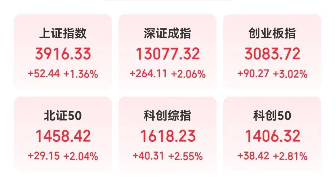 今天(10月21日)A股主要指数全线上涨,上证指数重回3900点大关,创业板指和科创50涨幅均超2.8%。全市场成交额近1.9万亿元,较上一交易日放量超1300亿元,上涨个股超4600只。涨幅在20%以上的个股多达11只,微创光电、中裕科技两只个股“30cm”涨停,正元地信、芳源股份等多只个股“20cm”涨停。
