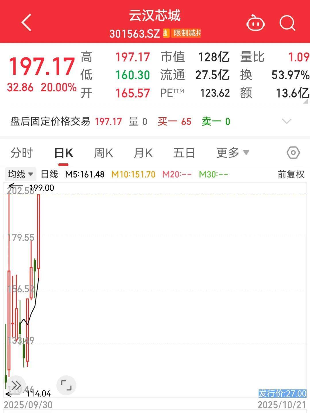 其中,云汉芯城(301563)也录得“20cm”涨停,该股是9月30日上市的次新股,今天涨停后股价创出收盘新高。值得一提的是,今天该股全天换手率接近54%,高居市场第二位。业内人士表示,云汉芯城之所有热度爆棚,主要是该股具有存储芯片、AI智能体、PCB、机器人和DeepSeek等多个热门科技概念。