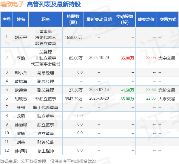 瑜欣电子的高管列表及最新持股情况如下: