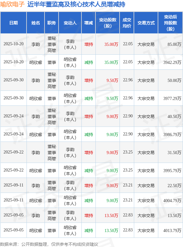 瑜欣电子近半年内的董监高及核心技术人员增减持详情如下: