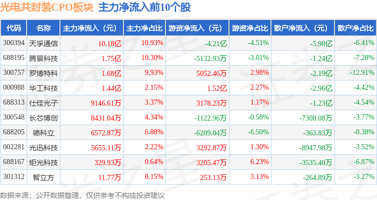 从资金流向上来看,当日光电共封装CPO板块主力资金净流出19.69亿元,游资资金净流入14.8亿元,散户资金净流入4.89亿元。光电共封装CPO板块个股资金流向见下表: