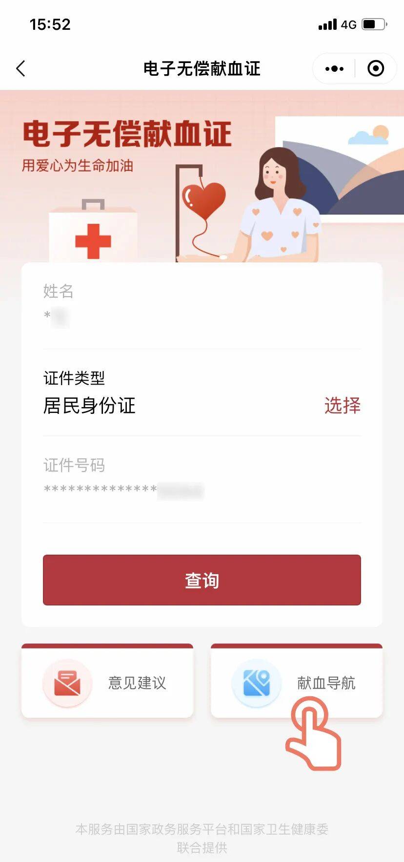 步骤二:进入服务后,根据系统提示选择居民身份证、护照、军人证等证件类型,填写信息,点击“查询”,即可显示本人全国电子无偿献血证及相关献血记录。