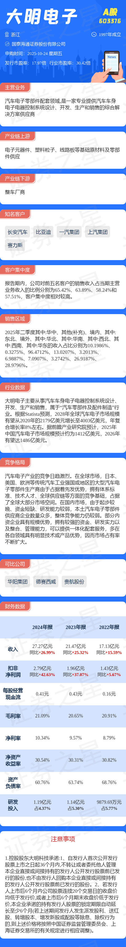 证券之星消息,大明电子10月24日网上申购,申购代码为732376,中签号公布日期为10月28日。该股概况请见下图: