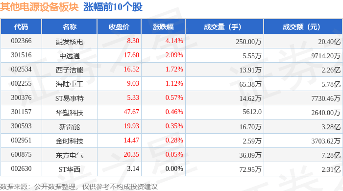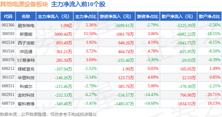 从资金流向上来看,当日其他电源设备板块主力资金净流出8.21亿元,游资资金净流出1.11亿元,散户资金净流入9.32亿元。其他电源设备板块个股资金流向见下表: