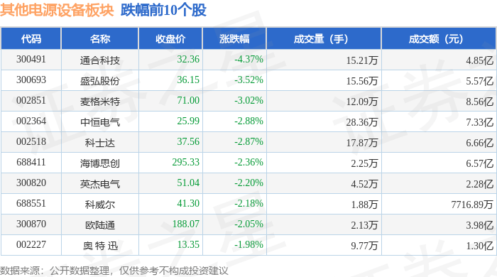 证券之星消息,10月23日其他电源设备板块较上一交易日下跌1.09%,通合科技领跌。当日上证指数报收于3922.41,上涨0.22%。深证成指报收于13025.45,上涨0.22%。其他电源设备板块个股涨跌见下表: