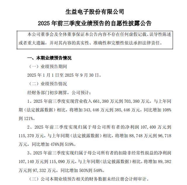 10月23日,生益电子(688183.SH)发布公告,预计2025年前三季度净利润为10.74亿元到11.54亿元,同比增加476%到519%。