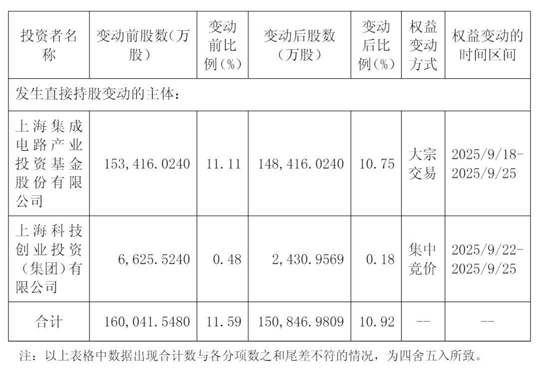 截至2025年9月25日,集成电路基金和科创投累计减持公司股票91,945,671股,减持股份比例约占公司总股本的0.67%,持股比例从11.59%减少至10.92%。