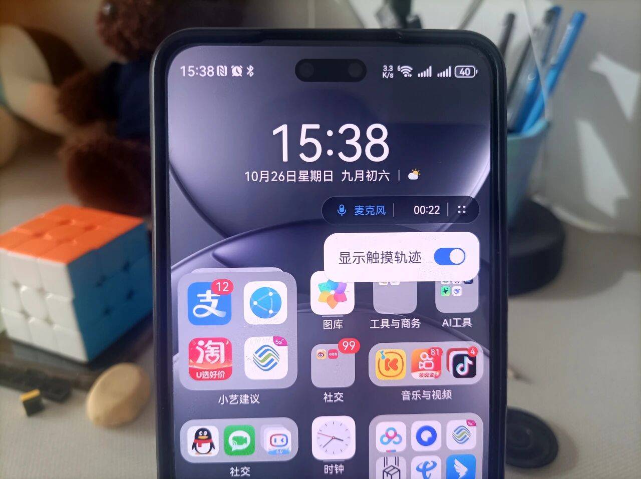 另外,在小红点的右侧,点击4个小点的图标,会出现一个选项,还可以设置是否“显示触摸轨迹”的功能,也是非常实用的。