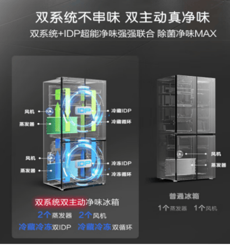 除菌净味技术堪称行业标杆:搭载的IDP双净2.0技术可主动释放3000万/cm³高浓度负离子,实现99.9999%除菌率、99.999%除毒率与99.9%净味率,更覆盖除乙烯、除农残等七重健康防护,冷冻、冷藏双区同步动态净化;搭配AI联网智控功能,用户通过爱家APP即可实时查看净味状态,智能化体验拉满。