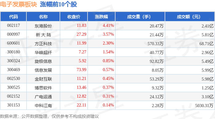 证券之星消息,10月27日电子发票板块较上一交易日上涨1.03%,东港股份领涨。当日上证指数报收于3996.94,上涨1.18%。深证成指报收于13489.4,上涨1.51%。电子发票板块个股涨跌见下表: