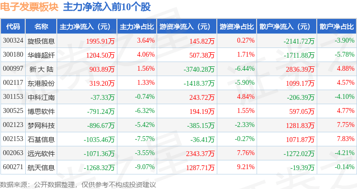 从资金流向上来看,当日电子发票板块主力资金净流出8.51亿元,游资资金净流入9318.76万元,散户资金净流入7.58亿元。电子发票板块个股资金流向见下表: