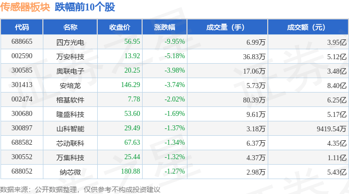 证券之星消息,10月27日传感器板块较上一交易日上涨2.48%,万朗磁塑领涨。当日上证指数报收于3996.94,上涨1.18%。深证成指报收于13489.4,上涨1.51%。传感器板块个股涨跌见下表: