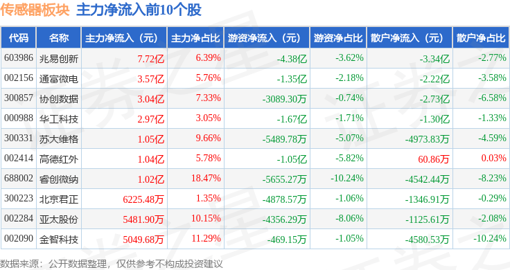 从资金流向上来看,当日传感器板块主力资金净流入7.15亿元,游资资金净流出7.59亿元,散户资金净流入4419.9万元。传感器板块个股资金流向见下表: