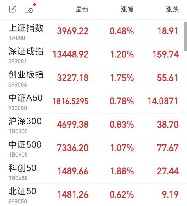 周一,A股三大指数集体高开。上证指数涨0.48%,报3969.22点;深证成指涨1.20%,报13448.92点;创业板指涨1.75%,报3227.18点。