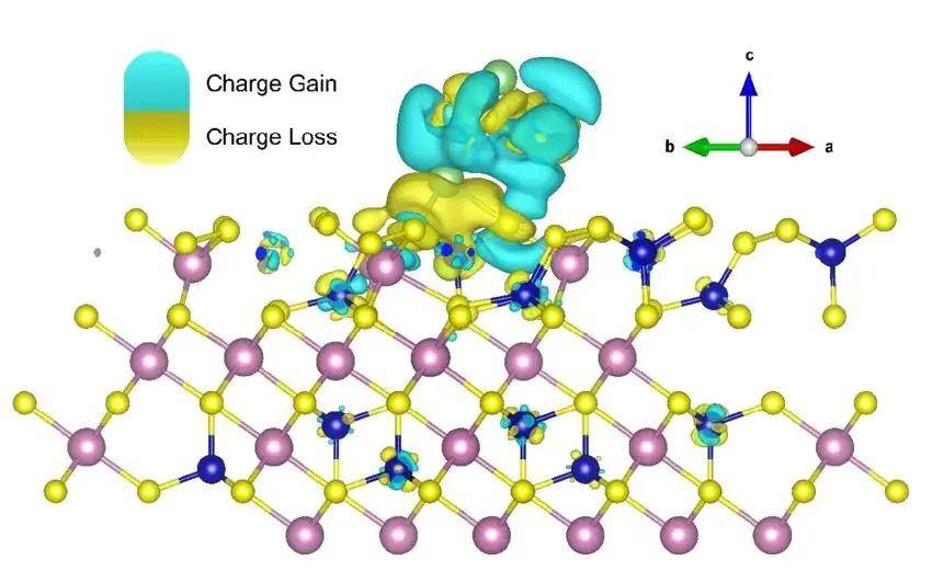 先去做催化剂的,这里修改一下POSCAR,把水分子移除,提交任务,再去到水分子的文件夹修改POSCAR,把催化剂原子移除,然后修改一下赝势POTCAR,只有O和H的赝势,提交任务,等这三个自洽计算都做完,把电荷下载,用 VESTA 软件来做一个电荷密度的差就可以了。前两个已经算完了,那么我们开始下载电荷,先下载 s1 的CHGCAR,然后重命名叫 s1.vasp,再下载 s2 的重命名为 s2.vasp,下载 s3 的电荷文件,重命名为 s3.vasp。下载完毕后,用VESTA 软件打开刚才的 s1. vasp,这是整体电荷,然后编辑体项数据,导入 s2 和 s3,这里做一个减法,再导入 s3 也是做一个减法。这样就有 s1 减 s2 减 s3 的电荷。对这个图做一个简单的修饰,就可以得到一个差分电荷。简单看一下这个水和铂之间,尤其是界面处有一定的电荷转移,但这个不强,因为中间这个键的区域是没有电荷的,说明这个是不成键的一个结果。