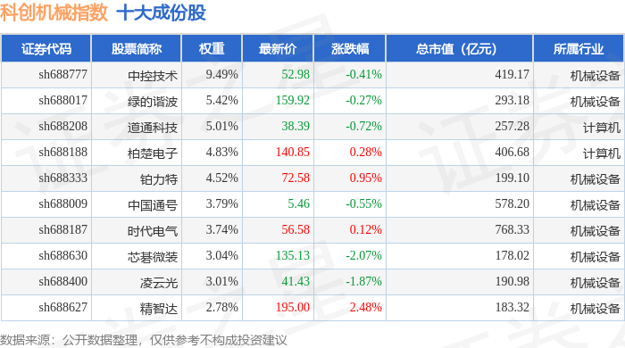 证券之星消息,10月28日,科创机械(000693)指数报收于1393.94点,跌0.31%,成交144.03亿元,换手率1.23%。当日该指数成份股中,上涨的有20家,燕麦科技以10.04%的涨幅领涨,下跌的有30家,四方光电以5.39%的跌幅领跌。