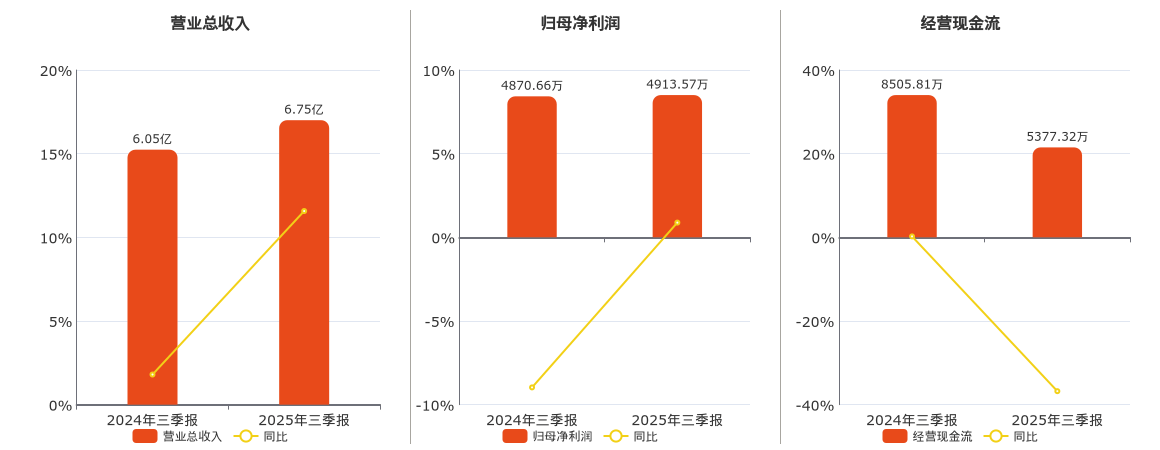 公司营业总收入为6.75亿元,在已披露的同业公司中排名第67。归母净利润为4913.57万元,在已披露的同业公司中排名第48。经营活动现金净流入为5377.32万元,较去年同报告期经营活动现金净流入减少3128.49万元,同比较去年同期下降36.78%。