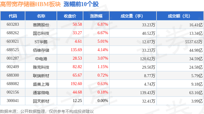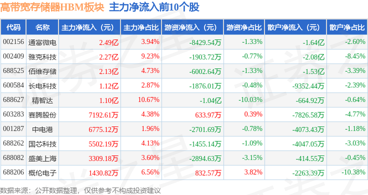 从资金流向上来看,当日高带宽存储器HBM板块主力资金净流入2735.32万元,游资资金净流入8223.17万元,散户资金净流出1.1亿元。高带宽存储器HBM板块个股资金流向见下表: