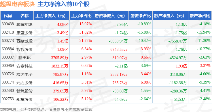 从资金流向上来看,当日超级电容板块主力资金净流出10.44亿元,游资资金净流出2.69亿元,散户资金净流入13.13亿元。超级电容板块个股资金流向见下表: