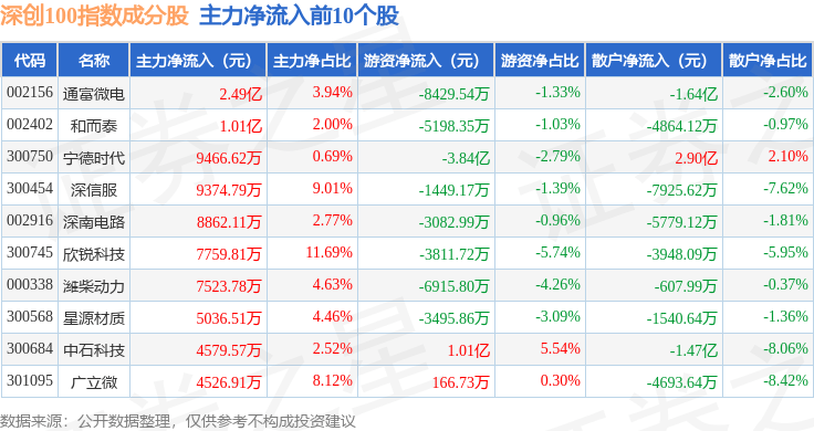 资金流向方面,深创100(399088)指数成份股当日主力资金净流出合计157.15亿元,游资资金净流入合计54.58亿元,散户资金净流入合计102.57亿元。成份股资金流向详情见下表: