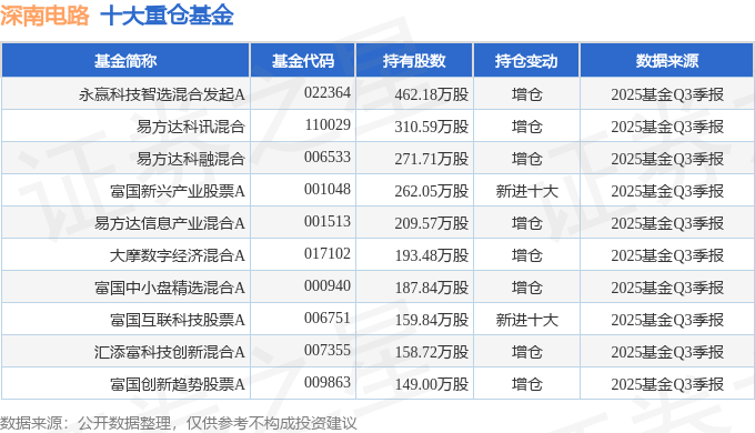 持有深南电路最多的基金为永赢科技智选混合发起A,目前规模为22.78亿元,最新净值3.6217(10月30日),较上一交易日下跌3.71%。该基金现任基金经理为任桀。