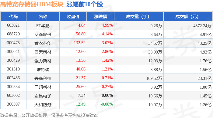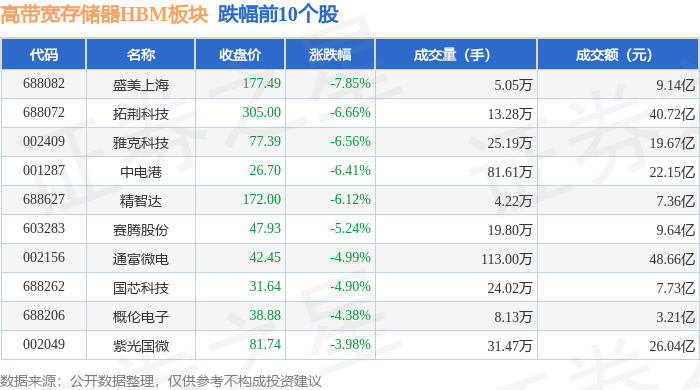 证券之星消息,10月31日高带宽存储器HBM板块较上一交易日下跌3.64%,盛美上海领跌。当日上证指数报收于3954.79,下跌0.81%。深证成指报收于13378.21,下跌1.14%。高带宽存储器HBM板块个股涨跌见下表: