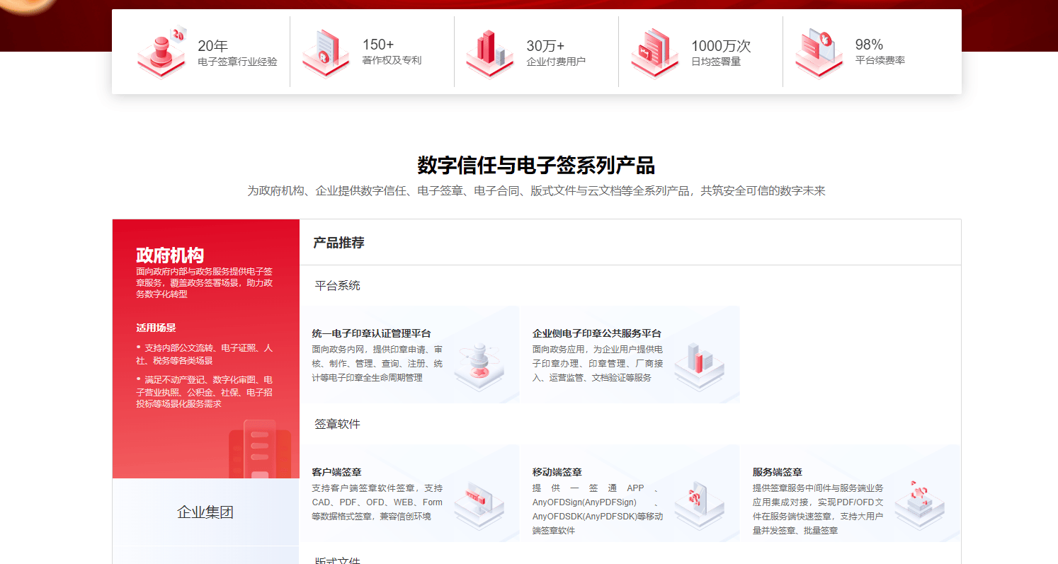 作为工程建设领域领跑者,构建了覆盖“流版签”全场景的自研产品体系,包括数字信任一体化管理平台、智慧印章管理平台等,支持 OFD、PDF、DWG 等多格式文件签署,实现从芯片、服务器到操作系统、数据库的全栈国产化适配。创新打造混合云架构,公有云集成主流办公生态,私有云保障核心数据本地化,灵活满足不同规模企业需求。
