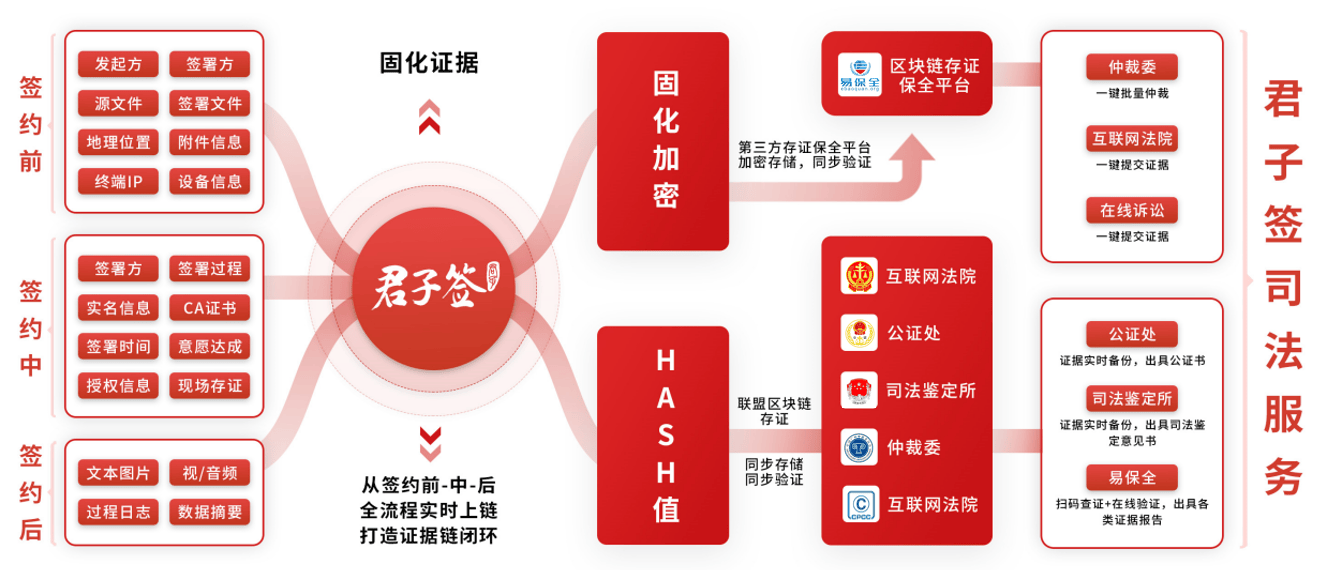 君子签是易保全旗下国内专业领先的区块链电子签约平台,以领先的区块链技术为基础,结合自主发明专利技术,创新“区块链+司法+电子签约”模式,主要为电子商务、物流、金融、保险、教育培训、供应链、HR、旅游、租赁、医疗、房地产、政务等企业及政府机构,提供从签订、管理、履约到争议解决的区块链电子合同全生命周期智能管理服务,拥有全领域电子签约解决方案,一站式解决企业合同签署难题。