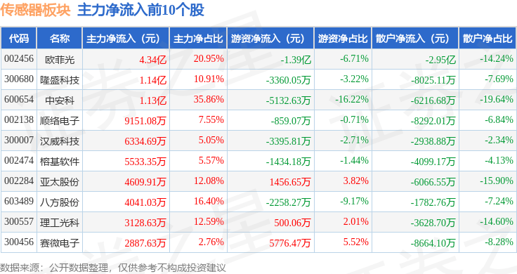 从资金流向上来看,当日传感器板块主力资金净流出48.22亿元,游资资金净流入14.01亿元,散户资金净流入34.21亿元。传感器板块个股资金流向见下表: