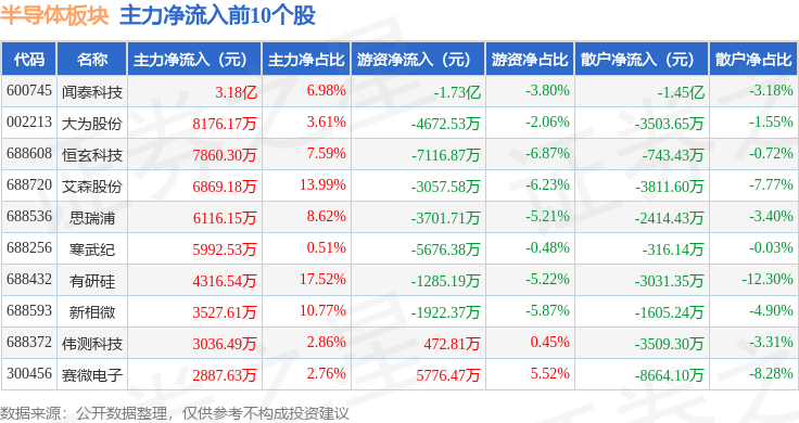 从资金流向上来看,当日半导体板块主力资金净流出155.75亿元,游资资金净流入66.49亿元,散户资金净流入89.26亿元。半导体板块个股资金流向见下表: