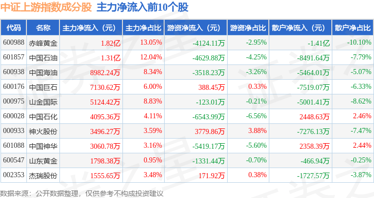 资金流向方面,中证上游(000961)指数成份股当日主力资金净流出合计60.26亿元,游资资金净流入合计16.49亿元,散户资金净流入合计43.77亿元。成份股资金流向详情见下表: