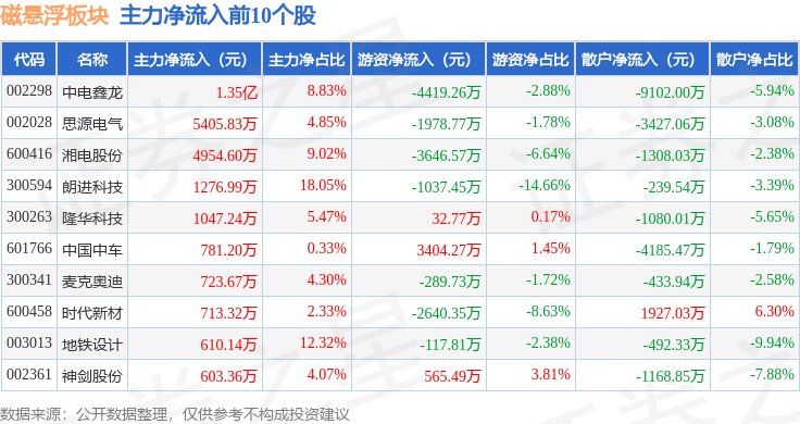从资金流向上来看,当日磁悬浮板块主力资金净流出19.63亿元,游资资金净流入6.17亿元,散户资金净流入13.45亿元。磁悬浮板块个股资金流向见下表:
