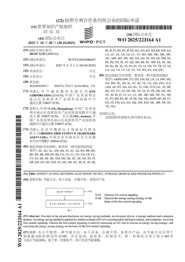 证券之星消息,根据企查查数据显示中兴通讯(000063)公布了一项国际专利申请,专利名为“节能方法、电子设备、存储介质、及程序产品”,专利申请号为PCT/CN2025/086697,国际公布日为2025年10月30日。